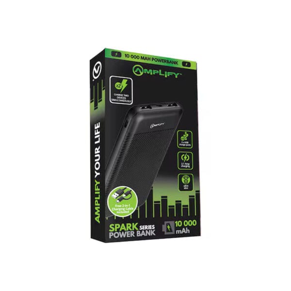 The AMPLIFY AMP-9008-BK is a compact 10000mAh power bank designed for fast and reliable charging on the go.